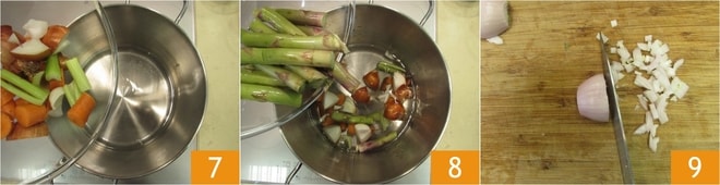 Prepara el caldo: coloca las verduras en una olla 7, añade también los tallos duros de los espárragos que reservaste 8. Cubre con agua y, comenzando con agua fría, cocina al menos media hora desde que hierva. Limpia y pica finamente la chalota 9.