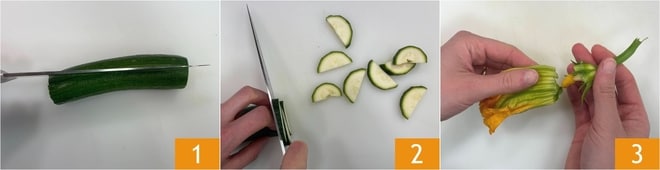 Para preparar el risotto con flores de calabacín, primero prepara las calabacines separándolas de sus flores. Divide los calabacines a la mitad a lo largo 1, luego córtalos finamente para obtener medialunas 2. Limpia las flores de calabacín eliminando el tallo 3 y el pistilo. Rasga en 2 o 3 partes las flores de calabacín que has separado de los calabacines y abre simplemente aquellas que se van a freír. Resérvalas.