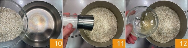 Pasa a la cocción del arroz: vierte el arroz en una cacerola 10, añade sal 11 y tuéstalo en seco. Cuando los granos estén calientes al tacto, echa el vino blanco 12 y deja que se evapore completamente.
