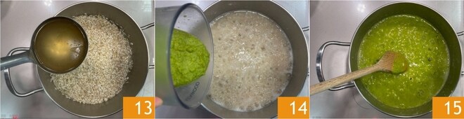 En este punto, moja el arroz con un cucharón de caldo de verduras caliente 13 y añade la mitad de la crema de calabacín 14. Mezcla bien 15 y cocina el arroz añadiendo un cucharón de caldo a la vez, esperando siempre que el anterior se haya absorbido.