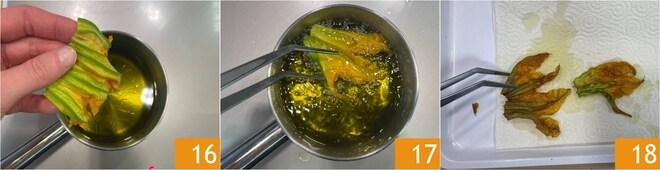 Mientras tanto, calienta el aceite de semillas hasta una temperatura de 170° y fríe las flores de calabacín para la decoración, bastarán 1-2 minutos 16. Una vez doradas, escúrrelas 17 y pásalas a papel absorbente 18.