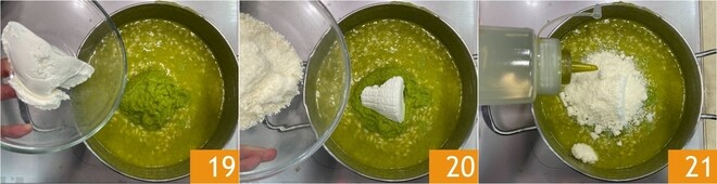 Cuando el arroz esté cocido, apaga el fuego y añade la crema de calabacín restante, luego manteca con la ricotta 19, el pecorino rallado 20 y un hilo de aceite 21.
