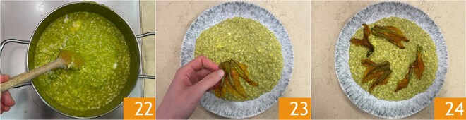 Mezcla bien para amalgamar y obtener la típica consistencia ondeante 22. Sirve en platos y decora con las flores de calabacín fritas 23. ¡Tu risotto con flores de calabacín está listo para ser servido 24!