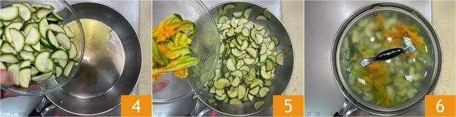 Vierte los calabacines en una sartén grande con un chorrito de aceite 4, salpimienta. Dóralos a fuego medio-alto durante unos 5 minutos, luego añade sus flores de calabacín 5. Tapa y deja cocer a fuego lento durante un par de minutos 6.