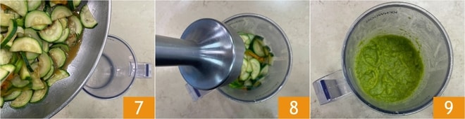 Una vez cocidos, transfiere los calabacines con las flores en un vaso para batir 7 y tritura con una batidora de inmersión 8 hasta obtener una crema lisa y homogénea 9.