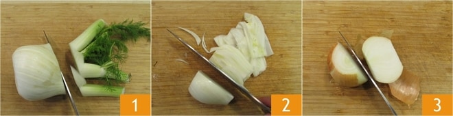 Para preparar el risotto de hinojo y primosale, primero limpia los hinojos guardando los restos 1. Luego córtalos en rodajas finas 2. Divide la cebolla por la mitad 3.