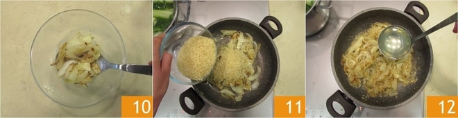 Transfiere un tercio de los hinojos cocidos a un bol y resérvalos para la decoración del plato 10. Vierte el arroz en la sartén con los hinojos cocidos 11, sala y tuesta a fuego alto durante un par de minutos, luego cubre todo con el caldo preparado con los restos 12.