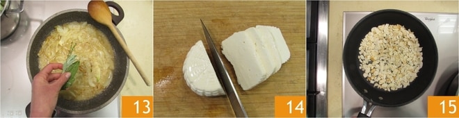 Añade también las hierbas aromáticas 13. Cocina el arroz añadiendo caldo según sea necesario durante unos 20 minutos. Corta el primosale en rodajas 14. En una sartén, tuesta las almendras en láminas 15.