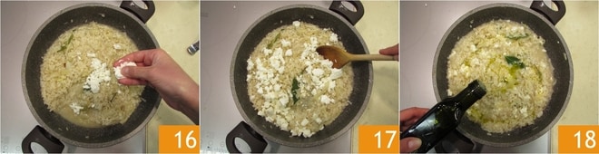 Transcurrido el tiempo de cocción, apaga el fuego y manteca el risotto con el primosale desmenuzado 16, mezcla 17 y termina con un chorro de aceite 18. Emplata decorando con los hinojos reservados, las almendras tostadas y algunas hojas de salvia. El risotto de hinojo y primosale está listo para ser disfrutado.