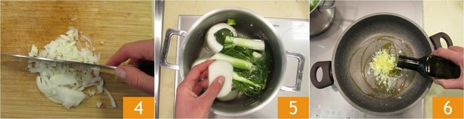 Pica finamente una de las dos mitades de la cebolla 4. Vierte en una olla llena de agua los restos de la limpieza de los hinojos y la otra mitad de la cebolla 5. Lleva a ebullición. Mientras tanto, vierte un hilo de aceite y la cebolla picada en una sartén 6.