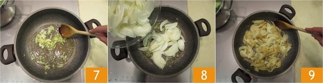 Sofríe la cebolla durante unos minutos 7. Añade también los hinojos en rodajas 8 y saltea en la sartén hasta que estén dorados 9.