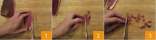 Para preparar el risotto con manzana y speck, lo primero que hay que hacer es preparar el Caldo de verduras y mantenerlo caliente. Luego, cortad lonchas de speck de un par de cm de grosor, eliminad la corteza 1, y contra la fibra, cortad primero en bastones 2 y finalmente en cubitos 3.