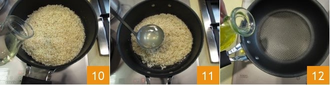 Tostadlo durante unos minutos, removiendo siempre, luego desglasad con el vino blanco 10. Esperad a que el alcohol se evapore por completo y empezad a añadir el caldo caliente al arroz 11 y continuad agregándolo solo cuando sea necesario. En otra cacerola bien caliente, verted un chorrito de aceite 12.