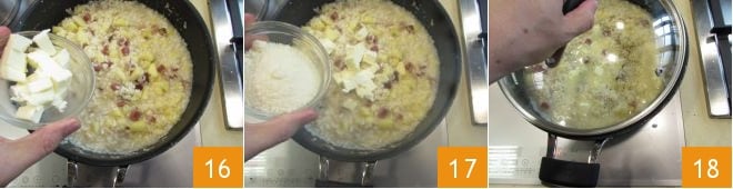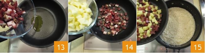 Añadid luego tanto el speck 13 como las manzanas 14 y saltead a fuego alto y doradlas. Cuando falten unos 3 minutos para que el risotto esté listo, añadid las manzanas y el speck 15, salpimentad al gusto.