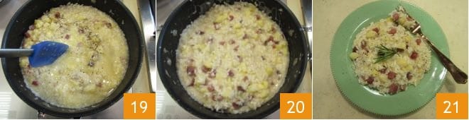 y mantecad el risotto, removiendo con cuidado y agitando la sartén para completar el mantecado (19-20). Vuestro risotto con manzana y speck está listo, adorna con unas agujas de romero y sirve 21.