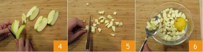 A continuación, pasad a las manzanas, cortadlas primero en 4, luego peladlas 4 y cortad cubos del mismo tamaño que los del speck 5. Para evitar que se oxiden, sumergidlos a medida que los cortéis en agua acidulada 6.