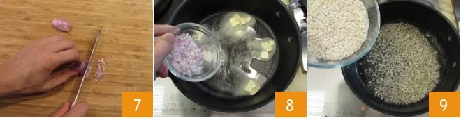Luego, prepara el sofrito. Pica finamente la chalota 7 y colócala en una cacerola donde ya habrás derretido la mitad de la dosis de mantequilla 8, el resto se usará para mantecar el risotto más tarde. Deja que la chalota se ablande ligeramente, removiendo a menudo, tardará unos 5 minutos (puedes añadir un cucharón de caldo caliente). Después, vierte el arroz dentro 9.