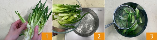 Para preparar el risotto con pecorino y puntarelle, lo primero que hay que hacer es limpiar las puntarelle desprendiendo las yemas de la parte dura central 1. Escaldarlas en agua hirviendo con sal durante unos segundos 2, luego escurrirlas y sumergirlas en agua helada o agua y hielo 3.