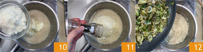 En una olla verter un chorrito de aceite, añadir el arroz 7 y tostarlo durante unos minutos, removiendo de vez en cuando. Añadir agua caliente 8 y cocinar agregando un poco más si es necesario, removiendo. Cuando esté cocido, apagar el fuego y añadir la mantequilla 9.