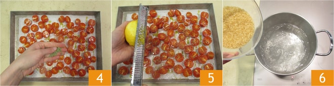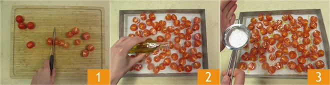 Para realizar el risotto con pesto de espinacas, empieza con los tomatitos: después de lavarlos, córtalos por la mitad 1 y colócalos en una bandeja de horno, condiméntalos con aceite 2, sal, azúcar glas 3,