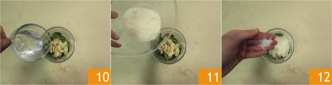 el aceite 13, la pimienta y tritura todo con una batidora de mano 14. Cuando el pesto quede homogéneo, estará listo, resérvalo 15.