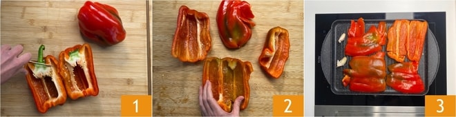Para preparar el risotto de pimientos con cacahuetes y queso, lava los pimientos, elimina la parte superior 1 y luego córtalos por la mitad a lo largo. Ábrelos y elimina las semillas y los filamentos 2. Sala una plancha para asar, y cuando esté bien caliente, asa los pimientos y el ajo 3, girándolos de vez en cuando, sin miedo a chamuscar la piel.