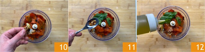 En el mismo procesador de alimentos, pon los pimientos, el ajo 10, algunas hojas de menta, sal, guindilla 11 y aceite 12.