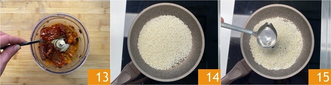Añade los tomates secos escurridos y tritura la mezcla 13. Tuesta el arroz en seco 14, luego mójalo con agua caliente con sal 15 y llévalo a cocción, añadiendo poco a poco más agua según sea necesario.