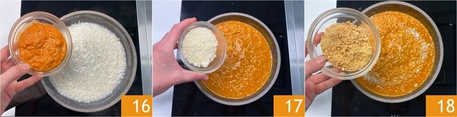 Cuando el arroz esté casi listo, añade la crema de pimientos 16, completa la cocción y, con el fuego apagado, remueve con el Parmigiano Reggiano 17 y añade el granillo de cacahuetes 18.