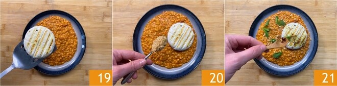 Asa los tominos en una plancha ya caliente, aproximadamente 2 minutos, luego sirve el risotto añadiendo a cada porción el tomino 19, un poco de cacahuetes triturados 20, guindilla al gusto y algunas hojas de menta 21. El risotto de pimientos con cacahuetes y queso está listo para ser servido.