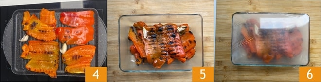 Cuando estén blandos y ahumados 4, retíralos del fuego, colócalos en un recipiente 5 y cubre con film transparente. Déjalos enfriar un poco 6.