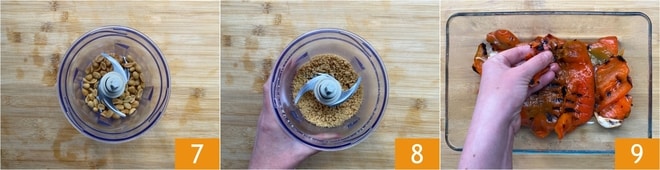 Tritura los cacahuetes 7, para obtener un polvo grueso 8 y resérvalo. Pela los pimientos y el ajo 9.