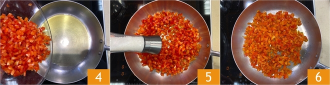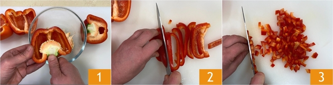 Para preparar el risotto con pimientos dulces y crumble de anchoas, primero limpia los pimientos: elimina semillas y filamentos internos 1 y corta la pulpa primero en tiras 2 y luego en brunoise 3.