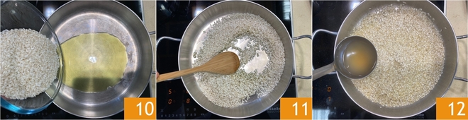 Pasa al risotto: echa el arroz en una cacerola con un chorrito de aceite caliente 10 y tuéstalo durante unos minutos, removiendo a menudo 11. Comienza a cocinar el arroz añadiendo un cucharón de caldo caliente cada vez, esperando a que el líquido se absorba completamente antes de añadir más 12.