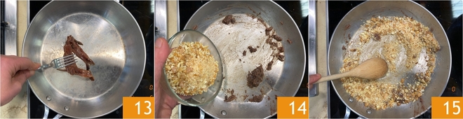 Mientras tanto, derrite las anchoas en otra sartén, aplastándolas con un tenedor 13. Una vez derretidas, añade las migas de pan duro 14 y tuéstalas durante unos 5 minutos a fuego medio-alto, removiendo a menudo 15.