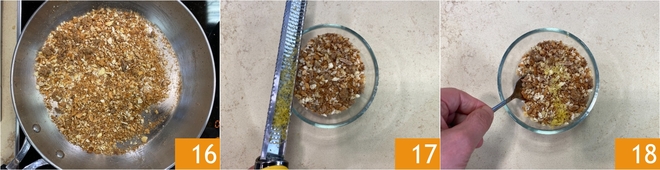 Cuando estén doradas y crujientes 16, aromatiza con la ralladura de limón 17 y mezcla 18. Reserva a un lado.