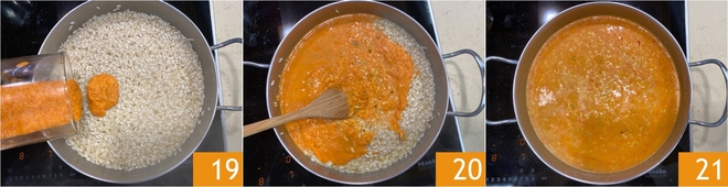 Después de 10 minutos de cocción del arroz, añade la crema de pimientos 19 y mezcla bien 20. Continúa la cocción del arroz durante otros 4 minutos 21, luego apaga el fuego.
