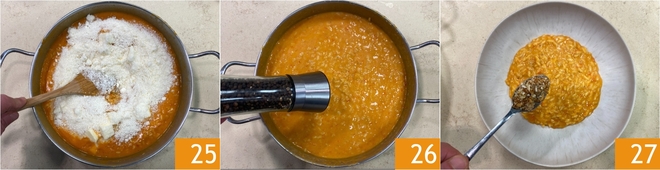 Fuera del fuego, mantecara el risotto con el vinagre 22, la mantequilla fría en cubos 23 y el Parmigiano Reggiano DOP rallado 24.