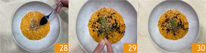 Finalmente adorna con polvo de limón quemado 28, un poco más de ralladura de limón y una ramita de eneldo 29. ¡Tu risotto con pimientos dulces y crumble de anchoas está listo para ser servido 30!