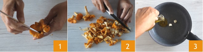 Para preparar el risotto con setas y salchicha, primero limpia los rebozuelos: elimina el exceso de tierra frotándolos suavemente con un paño; luego cepíllalos con un pincel de cerdas suaves 1 y, si es necesario, ráspalos con un cuchillo de hoja lisa. Si hay mucha tierra, puedes pasar las setas rápidamente bajo un chorro de agua fría. Luego sécalos bien. Corta los rebozuelos en trozos 2, asegurándote de dejar algunas setas enteras para el emplatado final. En una sartén, vierte 40 g de aceite y el diente de ajo 3.