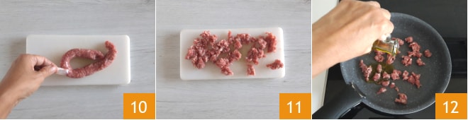 Prepara la salchicha: hazle un corte con un cuchillo de hoja lisa y elimina el intestino 10. Desmenúzala con las manos 11. Pon la salchicha en una sartén y sofríela con 10 g de aceite, dándole vuelta con frecuencia. Tomará alrededor de 5 minutos.