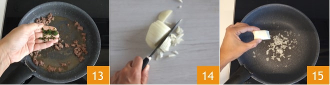 Ajusta de sal y sazona con el perejil 13. Reserva la salchicha hasta el momento de utilizarla. Calienta el caldo de verduras y comienza la preparación del risotto. Pela y pica la cebolla 14; sofríela en la sartén junto con 25 g de mantequilla 15.