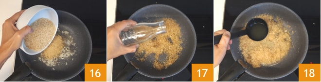 Añade el arroz y tuéstalo durante unos minutos 16, moviéndolo a menudo. Añade el vino blanco 17 y luego baja el fuego. Cocina durante 10 minutos, añadiendo, cuando sea necesario, poco caldo de verduras a la vez 18.