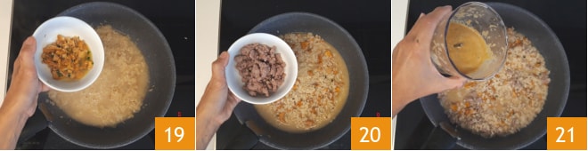 Añade las setas 19 y continúa la cocción durante 5 minutos. Añade la salchicha 20 y termina de cocinar el risotto. Al final de la cocción, añade la crema de setas y mezcla 21.