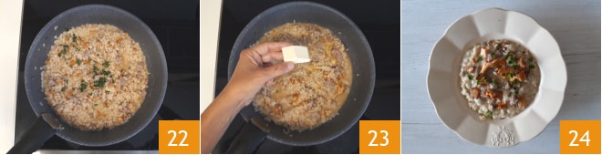 Apaga el fuego, añade el perejil fresco 22 y manteca con 35 g de mantequilla 23. Deja reposar 2 minutos, luego sirve y añade los rebozuelos enteros. Sazona con perejil fresco y sirve el risotto de setas y salchicha bien caliente 24.