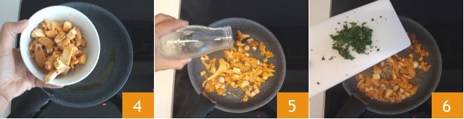 Calienta en el fuego y luego añade las setas 4. Cocina a fuego alto durante un par de minutos, luego añade 50 g de vino blanco 5. Salpimienta y continúa cocinando durante 10 minutos. Antes de apagar el fuego, añade el perejil fresco picado 6.