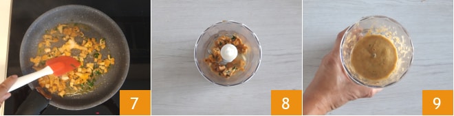 Las setas están listas 7, vierte un tercio en el tazón del mixer 8; añade una cucharada de caldo vegetal y tritura hasta obtener una consistencia cremosa 9 (recuerda no triturar las setas enteras que necesitarás al final para emplatar tu risotto). Reserva la crema de setas hasta el momento de utilizarla.