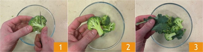 Para preparar el risotto con stracchino, brócoli y anchoas, lo primero que hay que hacer es limpiar los brócoli, tomar 4 floretes más grandes, en total unos 100 g 1 y dividir a la mitad 2. Añade a los floretes también las hojas verdes 3.