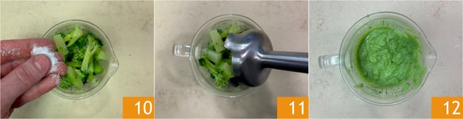 Ajusta de sal 10 y tritura con una batidora de inmersión 11 hasta obtener una mezcla cremosa y homogénea 12 y reserva.