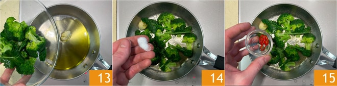En una sartén calienta aceite y ajo, luego añade los floretes de los brócoli y las hojas escaldadas anteriormente 13. Ajusta de sal 14, añade la guindilla en rodajas 15 y saltea por unos minutos, reserva.